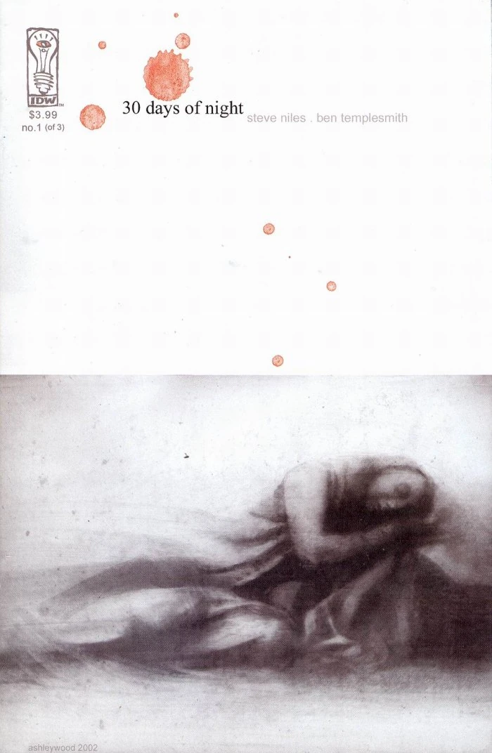 30 Days of Night was a three-issue comic book limited series published in 2002 by IDW Publishing. The series was written by author Steve Niles with painted artwork by Ben Templesmith. The series was lettered by Robbie Robbins and edited by Kris Oprisko. Cover illustrations were provided by Ashley Wood. All three issues were collected in hardcover and trade paperback graphic novel formats and were also included in the 30 Days of Night Trilogy hardcover collection. Two annual specials were published in 2004 and 2005. The series was adapted into the 30 Days of Night feature film in 2007. The premise of the series revolves around the small Alaskan town of Barrow. For thirty days out of every winter, the sun doesn't shine over the town, plunging the entire community into a month-long endless night. This proves to be a perfect feeding ground for a horde of vampires who no longer need to fear the fatal rays of the rising sun. Sheriff Eben Olemaun and his wife Stella have to find a way to protect their friends and survive the vicious vampire assault.