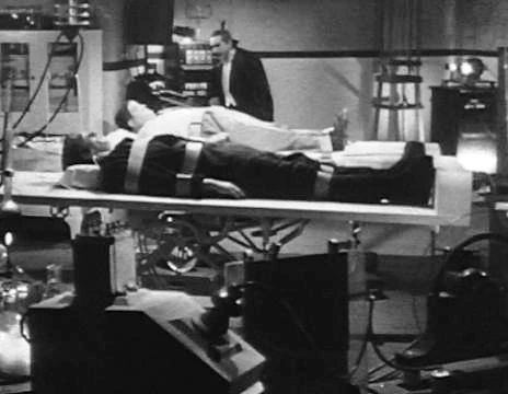 Hours later, Wilbur awakens inside a pair of stocks in the dungeon in Dracula's castle. Dracula emerges from his coffin and has Sandra prepare Wilbur for surgery. Wilbur tries to talk her out of it, but Sandra cannot defy the will of Dracula. She tells him that she is going to take Wilbur's brain and transplant it into the body of the monster. Professor Stevens confronts Dracula and wants to know why Joan Raymond is lying unconscious in Sandra's room. Sandra comes up behind him and clubs him over the head. Believing him dead, Dracula orders Sandra to dispose of Stevens' body.