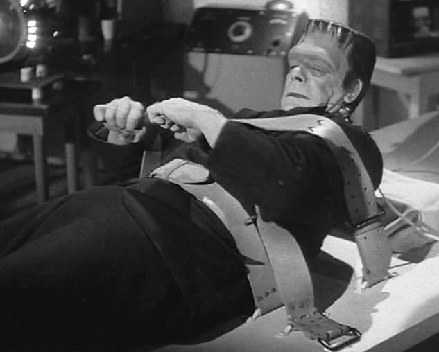 Meanwhile, the Frankenstein Monster awakens and breaks free of his bonds. Climbing down from the operating table, he lumbers over towards Wilbur. Sandra revives and bars the monster's path, ordering him to turn back. The monster scoops Sandra up into his arms and hurls her through the laboratory window. Chick races into the lab while the monster is distracted and frees Wilbur. The monster then begins shambling after them and they run out of the room. They race into another room and try to barricade the door, but this tactic fails and the monster continues to chase them. Wilbur finds a black tablecloth and uses it as a cape. Pretending to be Dracula, Wilbur is able to momentarily distract the creature.