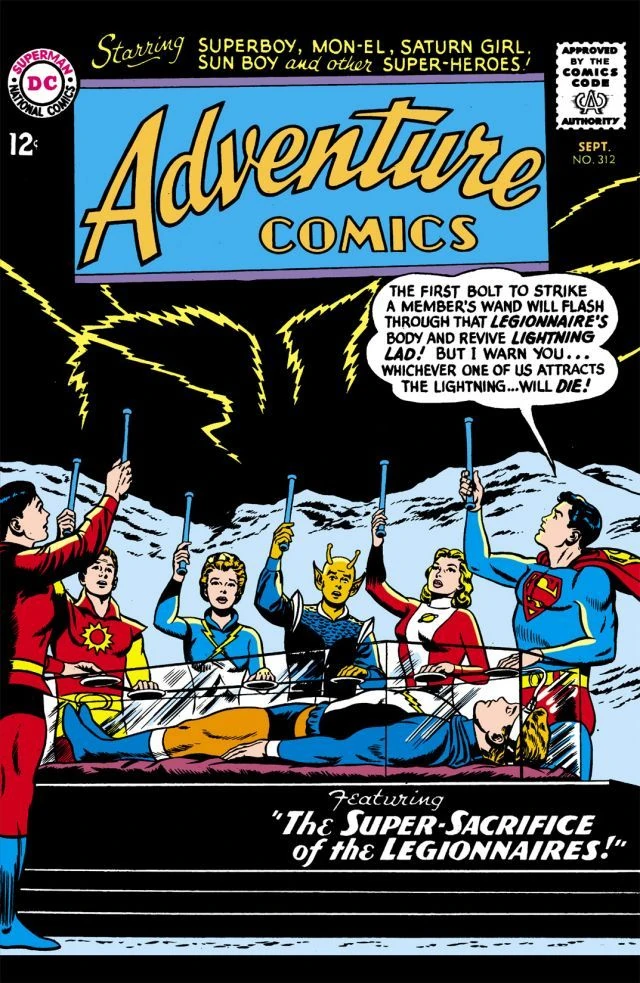 "The Super-Sacrifice of the Legionnaires!" is the title to the first chapter of a multi-part storyline in issue #312 of the Adventure Comics ongoing comic book series published by DC Comics. The story was written by Edmond Hamilton with artwork and inks by John Forte. It was lettered by Milt Snapinn and edited by Mort Weisinger. This issue shipped with a September, 1963 cover date and carries a cover price of .12 cents per copy.
