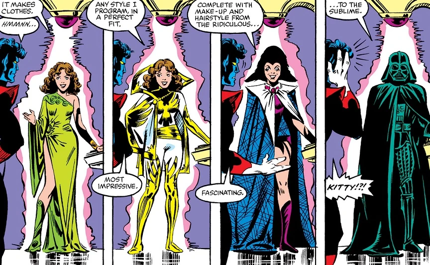 - In Marvel Comics' X-Men line of titles, the teenage character Kitty Pryde went to a Shi'ar space ship where she discovered a machine that could produce any type of clothing that she wanted. She showed off several examples to her teammate Nightcrawler, one of which included a reproduction of Darth Vader's armor. [3]