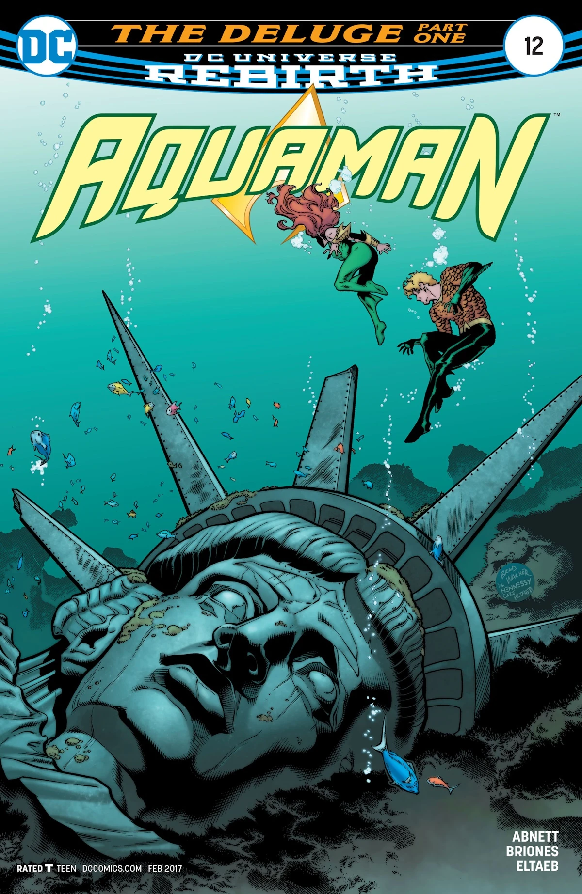 "The Deluge: Act One" is the title to the twelfth issue of the eighth series to carry the name Aquaman published by DC Comics. The story was written by Dan Abnett with artwork and inks by Philippe Briones. It was colored by Gabe Eltaeb and lettered by Pat Brosseau. The story was edited by Brian Cunningham with Amedeo Turturro and Diego Lopez as assistant editors. This issue shipped with an February, 2017 cover date and carries a cover price of $2.99 per copy (US).