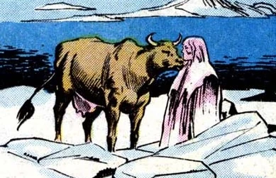 Audumbla sustained herself by licking at the ice, and in time, it had worn down to reveal a new species of man - the first of the Gods of what would one day be Asgard. This was Buri, whose lineage would go on to include Odin Borson, and Thor Odinson. [1]