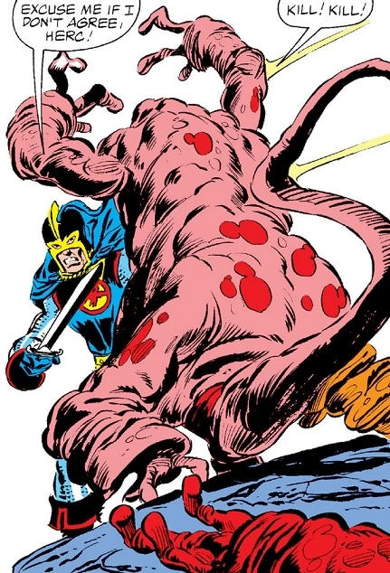 Back in Limbo, the three Avengers finally get done fighting up against the Dire Wraiths. One wraith begs for them to kill her. She reveals that Kang sent them to stop the Avengers, and that she would rather die mercifully then be tortured by Kang for failure. Hercules agrees if the wraith points them in the direction of Kang's lair. After traveling for many miles, they finally come upon Kang's castle. After getting a pep talk from Dane, Wasp shrinks down to insect size and slips through a crack in the entrance to disengage any alarms Kang may have set up. They come upon the body of the deceased Kang Councilor, whom Kang only recently murdered. Kang appears and pretends to blame the death of his temporal brother on the Avengers... just to enrage them. He then unleashes the Growing Man - a stimuloid who can increase his size. Hercules begins battling the robot and his surprised when he grows to twice its original size.
