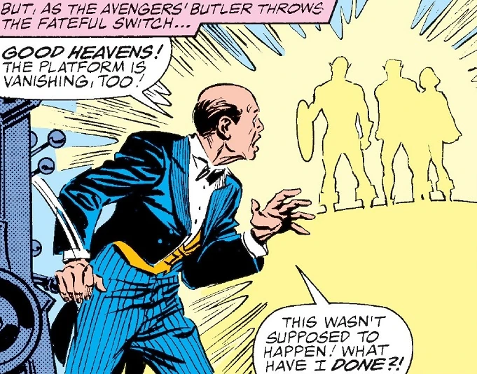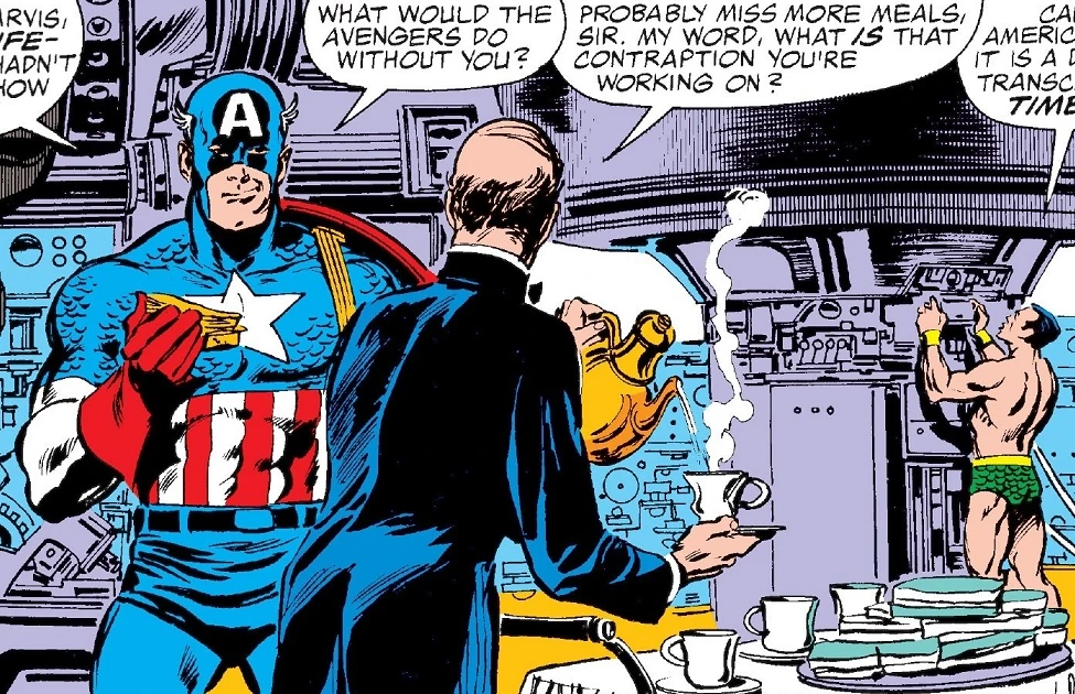 Back on Earth, Edwin Jarvis takes note of the throng of protesters and counter-protesters assembling outside of the mansion. He knew that opposition to the induction of the Sub-Mariner into the ranks of the Avengers was to be expected given Namor's controversial history. Jarvis brings coffee and sandwiches to Cap and Namor, who are working in the electronics lab. They are putting the final repairs touches on a Doctor Doom's Time Platform that they acquired from the Leader on a previous mission.
