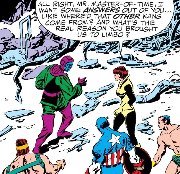 Trapped in Temporal Limbo, the Black Knight, Hercules, and the Wasp stare at images from the Avengers' past, including an apparition of Iron Man's original gold armor. They encounter the Space Phantom, whom the Wasp recalls from one of the Avengers' earliest missions. He seems befuddled, but when Janet tries to ring information out of him, he is zapped in the back by an energy blast. Jan and Hercules turn around to find Kang mockingly laughing at them. This is just a hologram however, and he taunts them to come find the real Kang.