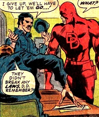 He brings the thugs to the 17th precinct, but unfortunately the police cannot hold them as they did not commit any crimes. Suddenly, Shanna, the She-Devil walks into the station with her two pets, Biri and Ina. She has arrived to lend Daredevil assistance on the Black Spectre case. The criminals are led away, but without-warning, they self-destruct.