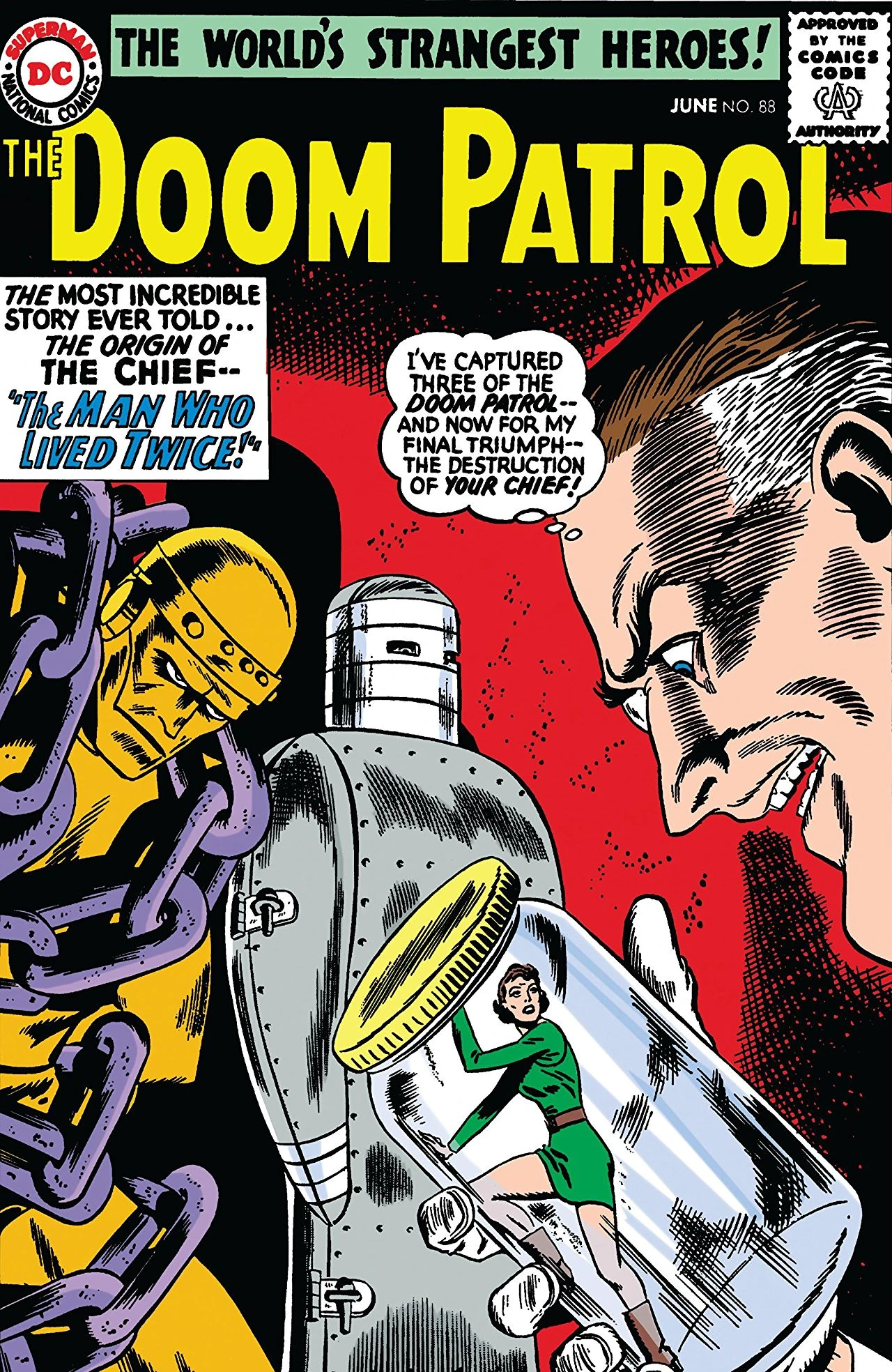 "The Incredible Origin of the Chief" is the title to issue #88 of The Doom Patrol. The story was written by Arnold Drake with artwork and inks by Bruno Premiani. It was lettered by Stan Starkman. The cover art illustration was rendered by Bob Brown. The story was edited by Murray Boltinoff. This issue shipped with a June, 1964 cover date and carries a cover price of .12 cents per copy.
