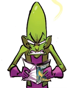 Impy, the Impossible Man, finishes reading the first issue of Fantastic Four, Volume 6. He is furious that the full team doesn't really appear together in the issue. A postal carrier, who looks suspiciously a lot like Willie Lumpkin, walks up to him and hands him a letter. It is from the editorial staff of Marvel Comics, who promise him that the full team will be back together in issue #2. Impy is suspicious of this, and taking the form of Uatu the Watcher, tells the Marvel execs that he will be "watching" them.