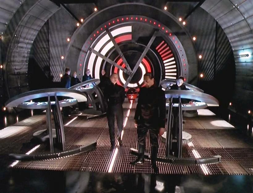 John begins walking away from these diagnostic repair drones (DRDs) and eventually makes his way to the bridge of the ship. He sees two aliens manning control stations and staring out the viewport of the ship. The larger of the two is a Luxan warrior named Ka D'Argo and the female is a Delvian priest named Pa'u Zotoh Zhaan. As he looks on in utter amazement, one of the DRDs manages to catch up to him and injects him in the foot with translator microbes. D'Argo rushes John and grabs him by the throat. Since Zhaan and he do not recognize the technology that comprises Crichton's ship, they want to know if it can help them escape from the Peacekeepers who are even now firing upon the ship. When John fails to yield any satisfactory answers, D'Argo tosses him aside and opens a communications channel to the ship's pilot (who is only ever referred to by the proper name "Pilot"). D'Argo commands Pilot to give him greater maneuverability, but Pilot is unable to comply since the ship is still bound by a control collar encircling its hull. The angry Luxan begins tearing wires out of a systems panel hoping to find some way to gain greater control of the vessel. While John sits on the floor gaping in awe, a third alien enters the room. He is a diminutive frog-like being named Rygel XVI. Floating on a personal hover-throne, he tells D'Argo and Zhaan that there are no other captives located on the ship. John begins to realize that these three are escaped prisoners. D'Argo continues to savagely tear away at a mass of wires and cables and unwittingly disengages the ship's control collar. The components that comprise the collar fall away and drift off into space. D'Argo orders Pilot to initiate a starburst - a type of hyperdrive propulsion common to all Leviathans. An energy trail grows around the ship and it instantly whisks off towards another part of the galaxy. A crippled Prowler, caught within the starburst's energy trail is taken along with them.