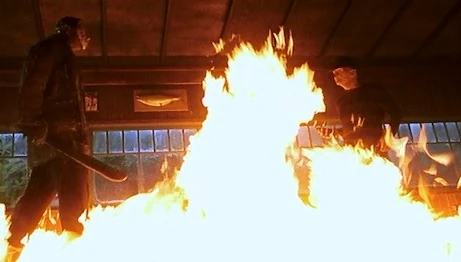 Lori found a gas hose hooked up to a generator, and began spraying the dock with fuel. Freddy sliced off Jason's fingers and then caught his machete and began hacking at Jason with his own weapon. Once he got Jason down on the ground, he stabbed him through the eye holes of his mask with his claws. By this point, Lori was storming down the dock with two flaming pieces of wood in her arms. She screamed for Freddy to "Go to Hell!" and set the dock to the torch. As the flames raced down the dock, Jason took advantage of Freddy's surprise and punched his fist through his back with his fingerless hand. He then ripped off Freddy's claw arm. Krueger then plunged the machete into Jason's heart. The fire reached some nearby propane tanks, which exploded, destroying the entire dock. Freddy and Jason's flaming bodies rocketed across the lake.