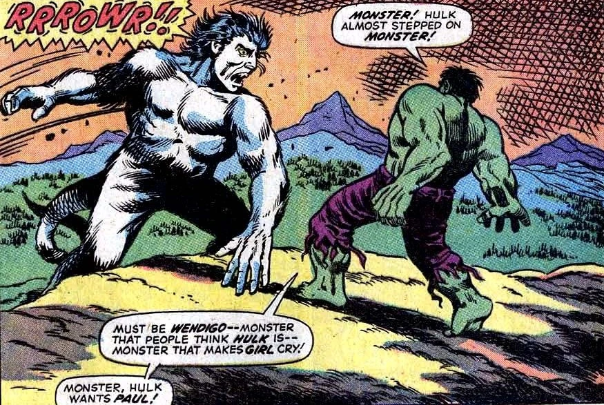 - One of the more humorous quotes spoken by the Hulk in this issue relates to his first exposure to the Wendigo. "Monster! Hulk almost stepped on Monster!"