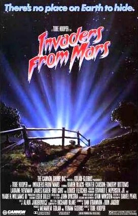 Invaders from Mars is an American science fiction/horror film directed by Tobe Hooper. It is a remake of the 1953 film Invaders from Mars, directed by William Cameron Menzies. It was produced by Canon Pictures and released theatrically in the United States on June 6th, 1986. The movie stars Hunter Carson as David Gardner, a young boy who learns that aliens from the planet Mars have come to Earth and are taking control of the minds of the town's parents.