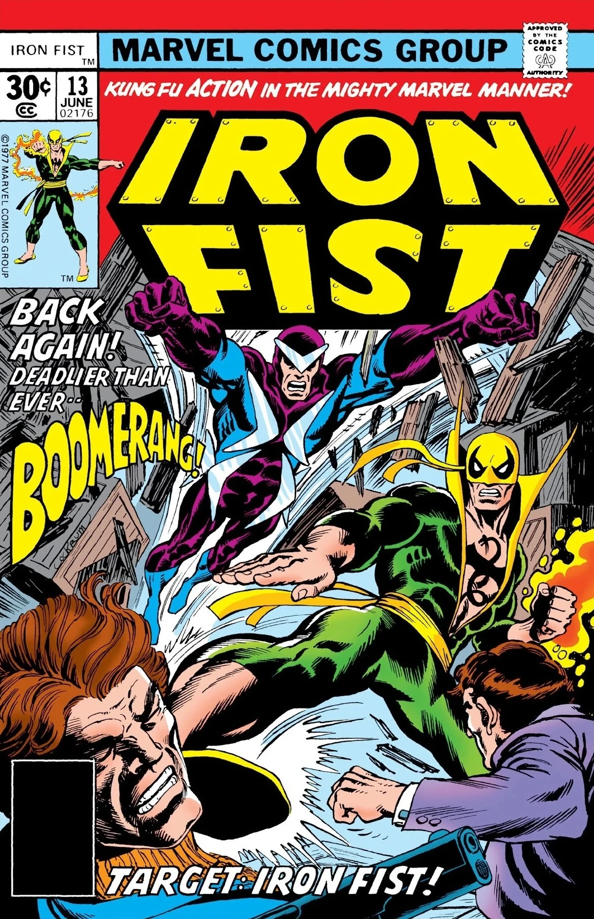 "Target: Iron Fist!" is the thirteenth issue of the first Iron Fist ongoing comic book series published by Marvel Comics. It was written by Chris Claremont with artwork by John Byrne and inks by Dan Adkins. It was colored by Marie Severin and lettered by Susan Fox. The story was edited by Archie Goodwin. This issue shipped with a June, 1977 cover date and carries a cover price of .30 cents per copy.
