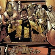Lando was consumed with grief over the part he played in the betrayal and subsequent capture of Han Solo. Having earned the trust of Luke, Leia and most importantly, Chewbacca, he set out in the Millennium Falcon on a feverish quest to rescue Han at all costs. Lando and Luke discovered that Boba Fett had a partner named Bossk, whom he had apparently double-crossed. They had hoped that if they could locate Bossk, his anger towards Fett might prompt him to tell them where the bounty hunter had taken Solo. They tracked Bossk and an assassin droid bounty hunter named IG-88 to the Outer Rim world of Stenos. While on Stenos, Lando ran afoul of a dangerous man from his past - Barpotomous Drebble. Lando had conned him out of some money back in his "scoundrel" days and Drebble demanded recompense. He offered a reward of 10,000 credits to any man willing to capture him. Dozens of underworld figures eagerly took Drebble up on his offer and Luke and Lando barely made it out of the densely populated area alive. [1]