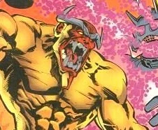 Mangog was a large monstrous being with brownish orange skin, three clawed fingers on each hand, two clawed toes on each foot and a long prehensile tail. He could stand anywhere between 12 and 25 feet tall and possessed a strength level that could even rival that of Thor. Mangog's essence came into being as part of the coalescing effect of billions of people who lost their lives at the hands of All-Father Odin. As a resevoir of conjoined vengeance, Mangog's existence has been completely fueled by hate, and sought nothing less than the death of Odin and the destruction of all he held dear.