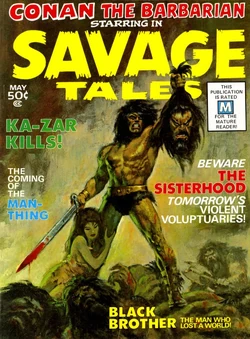 "The Frost Giant's Daughter" is the title to the first story presented in the premiere issue of Savage Tales, which is a black and white illustrated comic magazine published by Marvel Comics. The story is a Conan feature written by Roy Thomas with artwork by Barry Smith. The second story is a ten-page tale featuring the Sisterhood, and is written by Stan Lee with artwork by John Romita. The third vignette, introduces the character of the Man-Thing, and is written by Roy Thomas and Gerry Conway with artwork, inks and lettering by Gray Morrow. The following tale is called "Joshua's Burden", and is written by Sergius O'Shaughnessy with art by Gene Colan and inks by Tom Palmer. The final story features Ka-Zar and is written by Stan Lee. Artwork is provided by John Buscema. Buscema also rendered the cover art illustration for this issue. This issue shipped with a May, 1971 cover date and carries a cover price of .50 cents per copy.