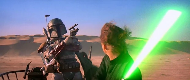 Boba Fett then used his rocket pack to fly from the barge to the skiff where he drew his blaster upon Skywalker. Luke cut through the blaster, so Fett ensnared him with a grappling line from his gauntlet. Luke cut himself free, but a second shot from the mounted cannon caused Boba Fett to fall over.