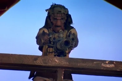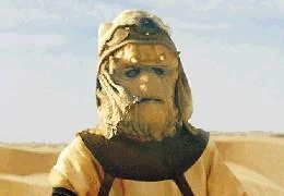 Of the aliens presented on the desert skiffs and on the upper deck of the sail barge, only Vedain and Queequeg actually resemble their movie counterparts. The human Taym Dren-garen is represented as a brown-skinned reptilian alien. An alien standing next to Taym, possibly a counterpart to Klaatu, is seen wearing tattered rags and looks nothing like any alien species from the mythos.