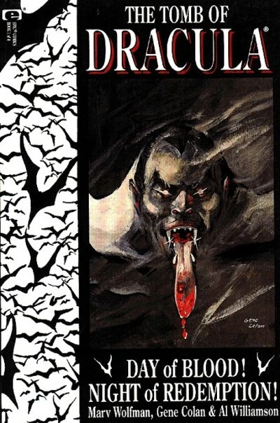 "Day of Blood! Night of Redemption!" is the title to the first issue of the Tomb of Dracula graphic novel limited series published by Marvel Comics under their Epic Comics imprint. The story was written by Marv Wolfman with artwork by Gene Colan and inks by Al Williamson. Colan also rendered the cover art graphic to this issue. It was colored by Lovern Kindzierski and lettered by Chris Eliopoulos. The story was edited by Terry Kavanagh with Mark Powers as assistant editor. This issue shipped in October, 1991 and carries a cover price of $4.95 per copy (US).